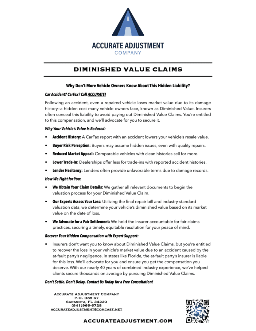 A professionally crafted and accurate Diminished Value Report ensures that you receive a settlement amount that accurately reflects the decline in market value your vehicle has suffered due to the negligence of the at-fault party.